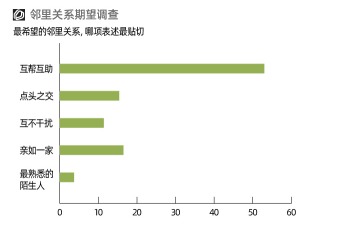 除了以上硬件設(shè)施環(huán)境,鄰里關(guān)系這樣的軟性條件也極大影響人們居住質(zhì)量。和“年輕人不愛社交”這樣的普遍認知不同,調(diào)研發(fā)現(xiàn)53%受訪者期待互幫互助的鄰里關(guān)系,更有16.5%的人希望和鄰居親如一家?!斑h親不如近鄰”,在當(dāng)下依然沒有過時。