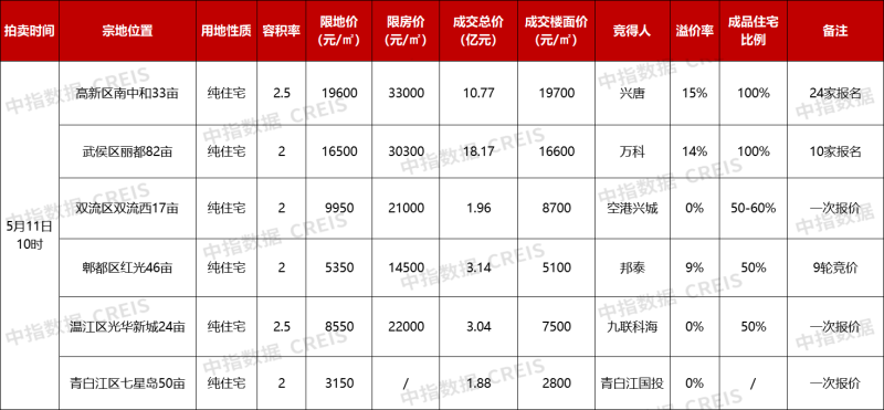 據(jù)中指研究院監(jiān)測,本次出讓中,只有2宗宅地位于主城區(qū),其獲得關(guān)注熱度高、參拍企業(yè)多。最終,高新區(qū)南中和33畝宗地和武侯區(qū)麗都82畝宗地價格達(dá)到觸頂“熔斷”,分別由興唐地產(chǎn)和萬科以樓面價19700元/平方米、16600元/平方米搖中。