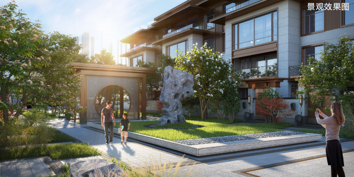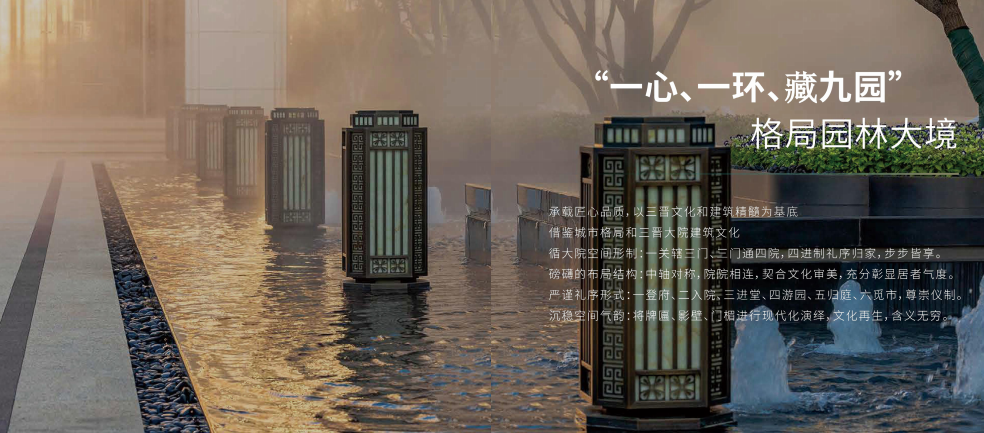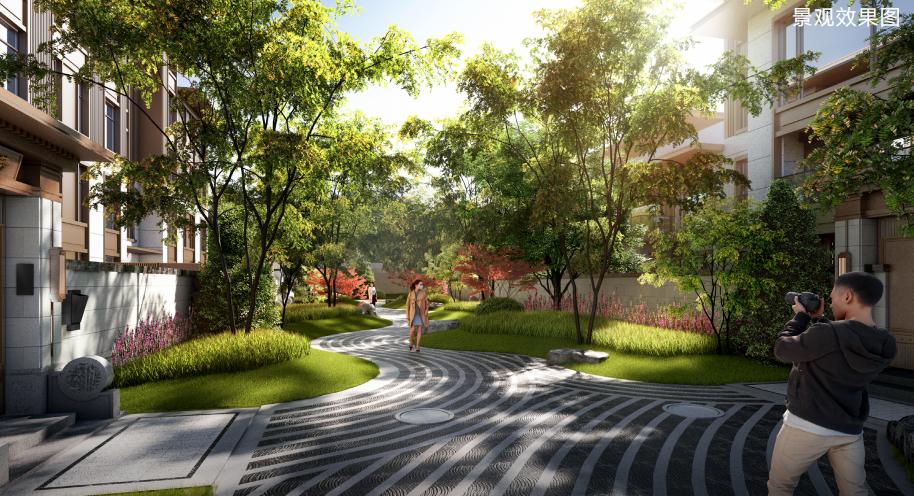 項(xiàng)目整體景觀設(shè)計(jì)以山林水源,禪意大宅為主線,將江南園林與皇家園林相結(jié)合,形成前府后院的園林形態(tài),景觀采用四級(jí)九景,四重栽植的造園手法,點(diǎn)綴了九個(gè)院落,四十個(gè)景點(diǎn)。園林鋪裝精致而具有設(shè)計(jì)感,在細(xì)節(jié)中加入特有的重視吉祥紋樣,更突出了新中式園林的設(shè)計(jì)風(fēng)格。