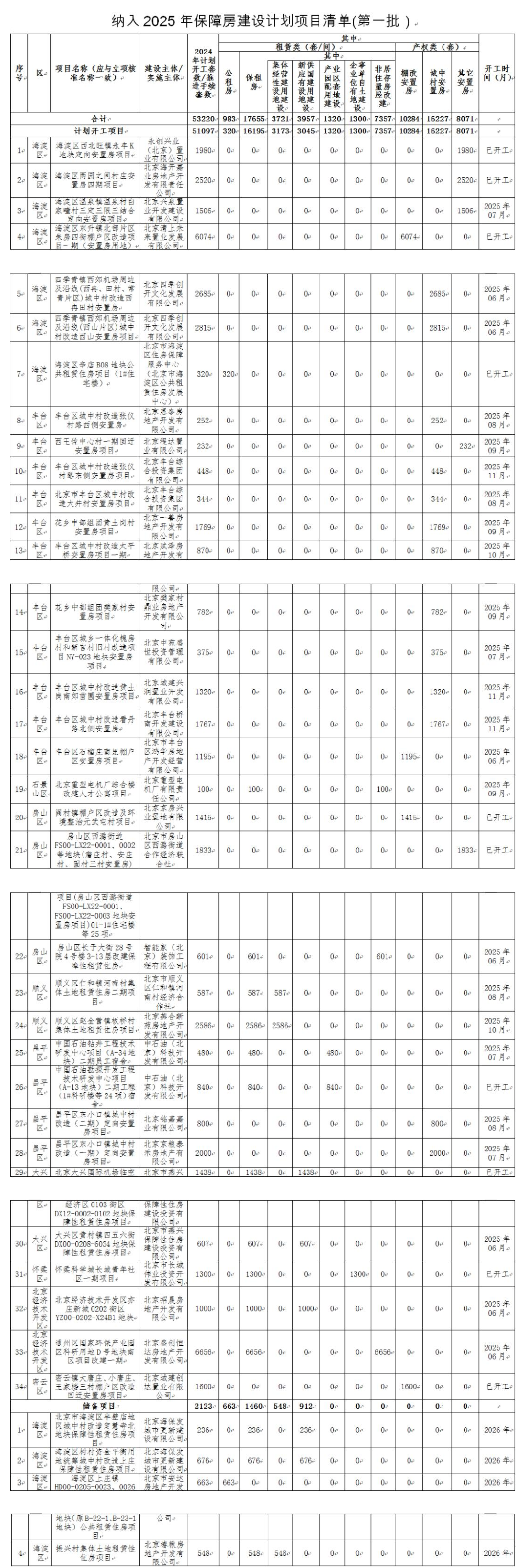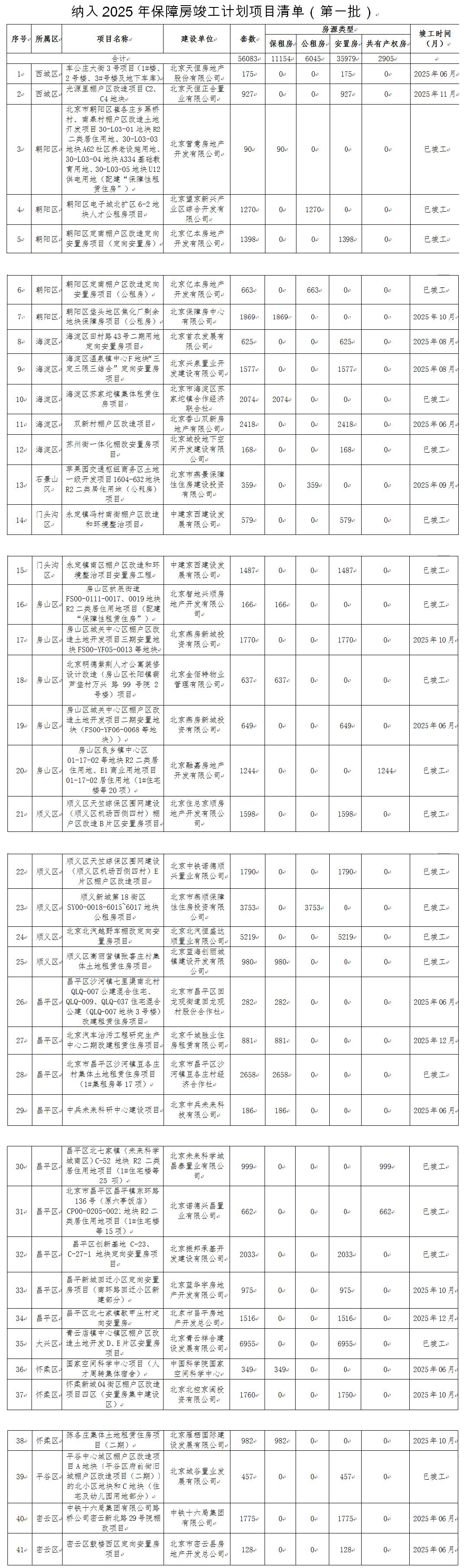 (2025年全市保障性住房建設(shè)計(jì)劃項(xiàng)目清單(第一批),圖源:北京市住建委) 除了計(jì)劃建設(shè)項(xiàng)目,通知顯示,今年還將有41個(gè)保障房項(xiàng)目計(jì)劃竣工,共計(jì)房源56083套,其中12個(gè)保租房項(xiàng)目、房源11154套;4個(gè)公租房項(xiàng)目、房源6045套;22個(gè)安置房項(xiàng)目、房源35979套;3個(gè)共有產(chǎn)權(quán)房項(xiàng)目、房源2905套。