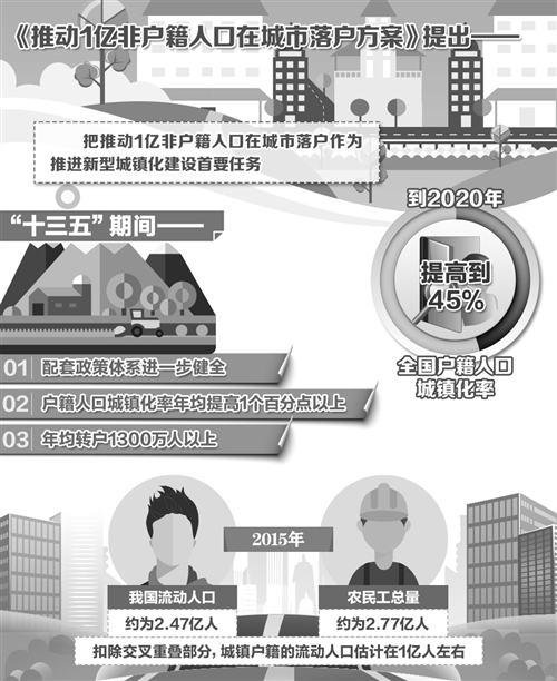如何推動(dòng)1億左右農(nóng)業(yè)轉(zhuǎn)移人口和其他常住人口等非戶籍人口在城市落戶,使有能力在城鎮(zhèn)穩(wěn)定就業(yè)和生活的農(nóng)業(yè)轉(zhuǎn)移人口舉家進(jìn)城落戶,是我國推進(jìn)新型城鎮(zhèn)化面臨的迫切任務(wù)。不久前,國務(wù)院辦公廳印發(fā)了《推動(dòng)1億非戶籍人口在城市落戶方案》(以下簡稱《方案》)。