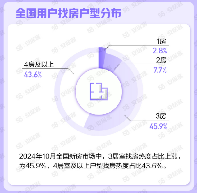 在用戶找房戶型方面,3居室仍為現(xiàn)階段熱度較高的戶型,找房熱度占比上漲,為45.9%,4居室及以上戶型找房熱度占比43.6%。張波分析稱,改善潛在需求入場的趨勢表現(xiàn)明顯,10月全國購房群體中三、四房的需求占比持續(xù)提升,二手房交易稅費(fèi)的減免加之利率下行,是推動(dòng)改善需求積極入市的組合性政策效果表現(xiàn)。