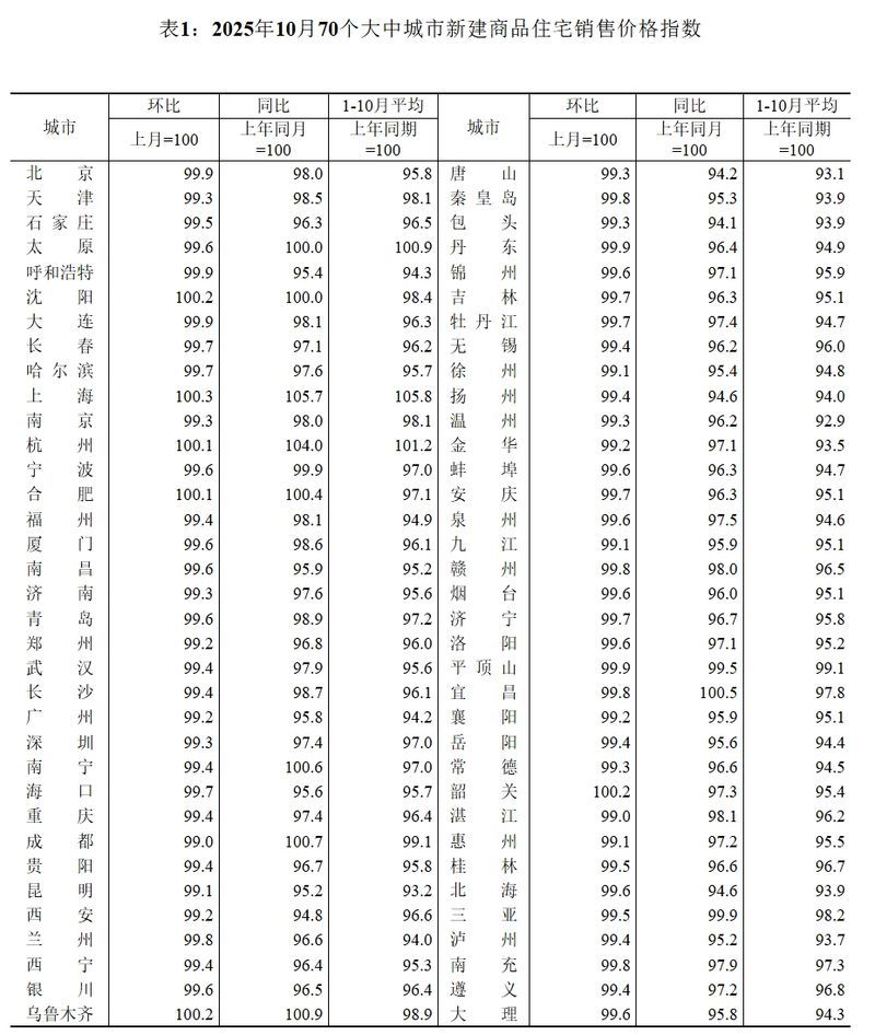 據(jù)國家統(tǒng)計局?jǐn)?shù)據(jù),10月份,一線城市新建商品住宅銷售價格環(huán)比下降0.3%,降幅與上月相同。其中,上海上漲0.3%,北京、廣州和深圳分別下降0.1%、0.8%和0.7%。二線城市新建商品住宅銷售價格環(huán)比下降0.4%,降幅與上月相同。三線城市新建商品住宅銷售價格環(huán)比下降0.5%,降幅擴(kuò)大0.1個百分點(diǎn)。