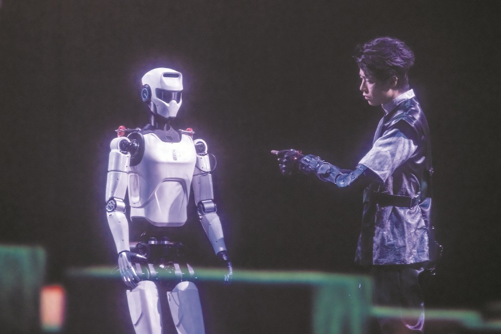這是發(fā)生在中國(guó)大戲院長(zhǎng)三角城市戲劇節(jié)中的最“科幻”一幕,國(guó)內(nèi)領(lǐng)先的機(jī)器人走出實(shí)驗(yàn)室和展廳,以接地氣、親和的方式來(lái)到普通人身邊。面對(duì)這樣的場(chǎng)景,人們不再那么陌生——2025春晚上,張藝謀導(dǎo)演的《秧BOT》讓人形機(jī)器人略顯滑稽地扭起秧歌;上半年,半程馬拉松也迎來(lái)人形機(jī)器人“跌跌撞撞”的身影?!拔覀?cè)谔剿饕环N可能性,試著模擬發(fā)生在未來(lái)的場(chǎng)景?!薄毒尬镏恰匪囆g(shù)總監(jiān)、上海戲劇學(xué)院藝術(shù)科技與管理學(xué)院副院長(zhǎng)沈倩對(duì)記者說(shuō),“無(wú)論對(duì)于機(jī)器人還是演藝產(chǎn)業(yè)來(lái)說(shuō),都具有破圈的意義。”誠(chéng)然,機(jī)器人仍在亦步亦趨地努力跟上人類(lèi)的節(jié)奏,但其不斷前進(jìn)的腳步已經(jīng)令人激動(dòng)。面對(duì)“人機(jī)共生”的時(shí)代命題,上海邁出了全國(guó)舞臺(tái)實(shí)踐的第一步。