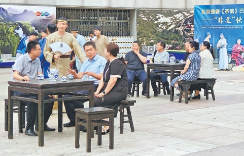 “喲,這位爺,您里邊請!”昨天下午,北京北站下沉廣場上,一位位身著戲服的曲劇演員登場,邀請過往行人移步至一旁的“茶館”品茶。旅客被演員帶入沉浸式表演中,現(xiàn)場不時發(fā)出笑聲和喝彩聲。原來這是北京市重點站區(qū)管理委員會北站辦與北京市曲劇團聯(lián)合策劃的“黨建引領(lǐng)·京韻暢行”快閃活動。此次快閃活動通過沉浸式表演,將北京曲劇《茶館》片段融入旅客和市民的出行場景。