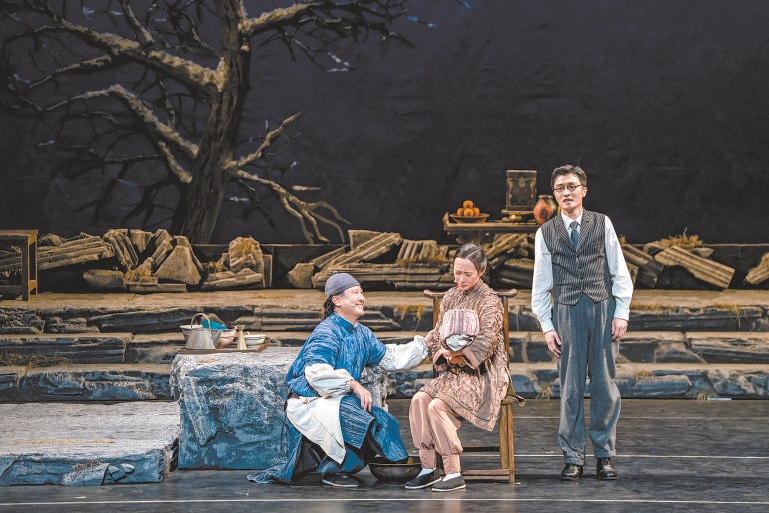 舞臺(tái)地面也由過(guò)去的雪地變成了石板地。石板形象參考了“圓明園”的石頭形制,隱喻著“石頭很頑強(qiáng),雖然被摧殘過(guò),但是它依然在,并且會(huì)一直存在下去”。臺(tái)前幾盆老舍先生最愛(ài)的菊花,也依舊開(kāi)得繁盛。