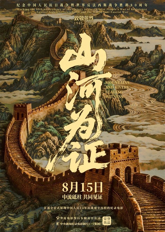 在紀(jì)念中國人民抗日戰(zhàn)爭暨世界反法西斯戰(zhàn)爭勝利80周年的重要?dú)v史時刻,紀(jì)錄電影《山河為證》正式宣布定檔,將于2025年8月15日登陸全國院線。影片由華夏電影發(fā)行有限責(zé)任公司與中央新聞紀(jì)錄電影制片廠(集團(tuán))出品,同步發(fā)布定檔版海報。 中國人民十四年抗戰(zhàn)全景式銀幕呈現(xiàn) 近期,紀(jì)念中國人民抗日戰(zhàn)爭暨世界反法西斯戰(zhàn)爭勝利80周年重點(diǎn)電影《山河為證》在國務(wù)院新聞辦公室舉行的新聞發(fā)布會上獲得正式推介。這部紀(jì)錄電影首次全景式展現(xiàn)中國人民14年抗戰(zhàn)艱辛歷程,影片所凝聚的強(qiáng)烈情感力量,以及對抗日戰(zhàn)爭英雄群像的真實(shí)記錄,構(gòu)筑起一幅關(guān)乎民族命運(yùn)的救亡圖存史,并呈現(xiàn)在當(dāng)代觀眾面前。創(chuàng)作上,《山河為證》秉承嚴(yán)肅的史學(xué)態(tài)度與高度的藝術(shù)責(zé)任,既注重歷史邏輯的清晰性,也強(qiáng)調(diào)民族精神的傳承性。在海量珍貴影像資料基礎(chǔ)上,主創(chuàng)團(tuán)隊(duì)運(yùn)用數(shù)字修復(fù)與藝術(shù)再造相結(jié)合的方式,從塵封檔案中喚醒時代記憶,為觀眾重現(xiàn)中華民族全民抗戰(zhàn)、熱血激蕩的歷史瞬間。畫面中的每一幀,都是鐵證如山的記憶;聲音中的每一次吶喊,都是不可磨滅的見證。 定檔海報凝練民族記憶,昭示信仰力量 同步發(fā)布的定檔海報,以極具視覺沖擊力的“新國風(fēng)”美學(xué),構(gòu)建起一幅莊嚴(yán)而震撼的紀(jì)念圖景。整幅畫面融合國畫山水與銅雕藝術(shù)質(zhì)感,雄渾壯闊的萬里長城自畫面底部蜿蜒而上,貫穿山河,宛如一條鋼鐵脊梁,守護(hù)著民族的精神高地;母親河黃河奔流其間,松柏挺立其側(cè),共同鑄就中華民族“銅墻鐵壁、山河永固”的象征意象。片名“山河為證”位于海報正中,銘刻著歷史的莊重誓言,蒼勁有力的書法線條融入奔涌山河的宏大圖景,象征著民族精神的脈動與大地記憶的延續(xù)。