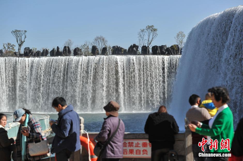 1月5日,游客在昆明瀑布公園內(nèi)游覽拍照。據(jù)了解,昆明瀑布公園1月1日開始對民眾開放,公園的瀑布利用牛欄江引水入滇工程而形成人工瀑布及湖泊,其利用約12.5米的地勢高差,建設(shè)成寬幅約400米的人工瀑布,是中國最大人工瀑布。 中新社記者 任東 攝