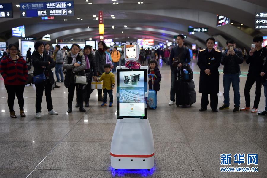 2月1日,旅客們?cè)趶V州南站與智能機(jī)器人“小璐”對(duì)話。當(dāng)日,一臺(tái)名叫“小璐”的智能機(jī)器人亮相廣州南站,吸引了大批旅客的圍觀,大家紛紛嘗試與“小璐”對(duì)話,向她咨詢列車時(shí)刻、購(gòu)票信息、天氣情況等問題,“小璐”不僅可以用甜美的女聲一一作答,還可以在接收到語(yǔ)音指令后,為旅客“唱歌”和“跳舞”。據(jù)了解,使用智能機(jī)器人服務(wù)旅客是廣州南站在今年春運(yùn)中的新嘗試,如果試用效果良好,今后有望在車站中看到更多智能機(jī)器人的身影。新華社記者 梁旭 攝