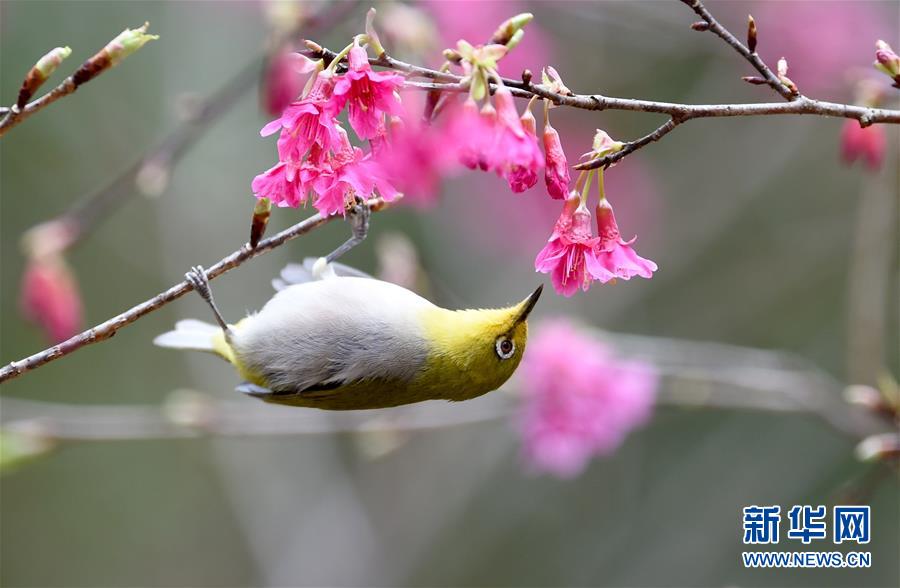 2月18日,一只綠翅短腳鵯鳥(niǎo)在福州森林公園櫻花園采食花蜜。隨著天氣轉(zhuǎn)暖,福州國(guó)家森林公園的2.5公頃櫻花園內(nèi)櫻花盛開(kāi),引得眾多鳥(niǎo)兒前來(lái)采食花蜜,春色盎然。 新華社記者 姜克紅 攝