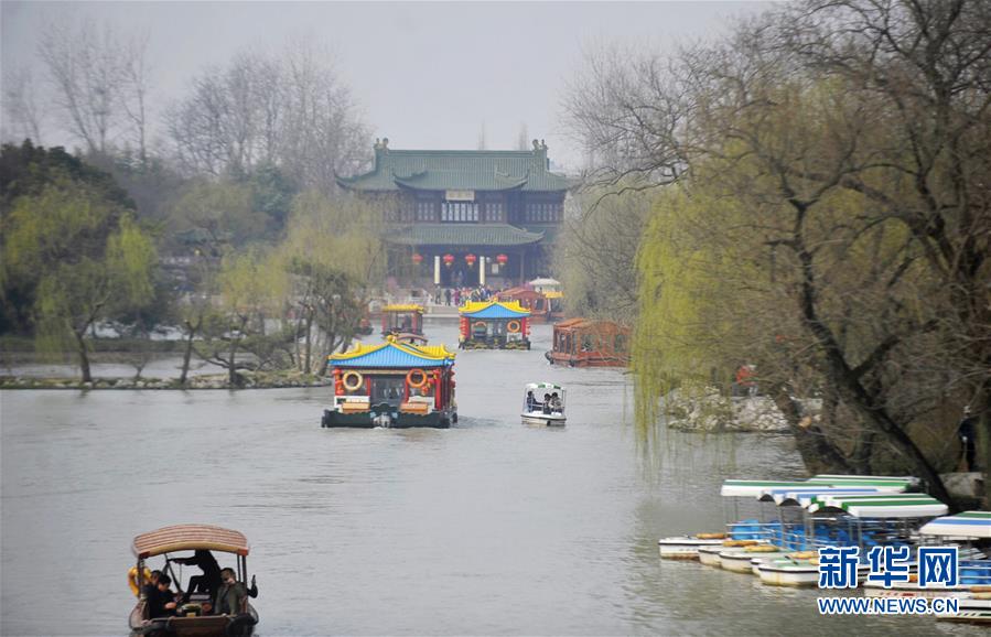 3月6日,游客在揚(yáng)州瘦西湖賞花。隨著氣溫升高,江蘇揚(yáng)州市瘦西湖景區(qū)楊柳吐綠,繁花似錦,吸引許多中外游客前來(lái)踏春賞花。 新華社發(fā)(孟德龍 攝)