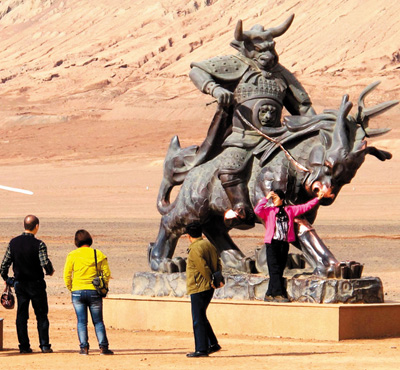 下車之后的第一站便是“西游文化長廊”,長廊之中安置了二十四幅《西游記》中經(jīng)典故事的壁畫。在“三借芭蕉扇”的畫前駐足,畫中的猴哥栩栩如生,看著墻上的故事,想想剛才見到的奇景,此行便越發(fā)興味盎然。走出展廳,進入廣場,眼前一根高大筆直的金箍棒吸引了我的視線,難不成是猴哥當(dāng)年用金箍棒換了鐵扇公主的芭蕉扇不成?實際上,這是一根溫度計,上面顯示著實時溫度,讓人直觀地感受著這里的酷熱。