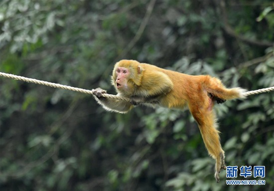 12月27日,在湖北省宣恩縣獅子關(guān)村,一只獼猴沿著人們?cè)诤由侠睦K索,爬到河對(duì)岸覓取食物。