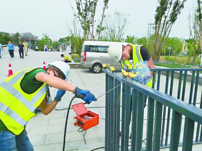上午9時,安裝工作正在進行,大約20只“小金鳥”陸續(xù)進入最后的焊接階段?,F(xiàn)場施工負責(zé)人郭中戌師傅告訴記者,“和原來那批相比,小鳥的牢固程度增加了三倍以上?!庇浾呖吹?,鋁制鳥身下方連接著一個長而細的不銹鋼管,鋼管穿透護欄,欄桿上方的部分噴膠,欄桿下邊的部分?jǐn)Q緊螺絲后再加一層焊接。