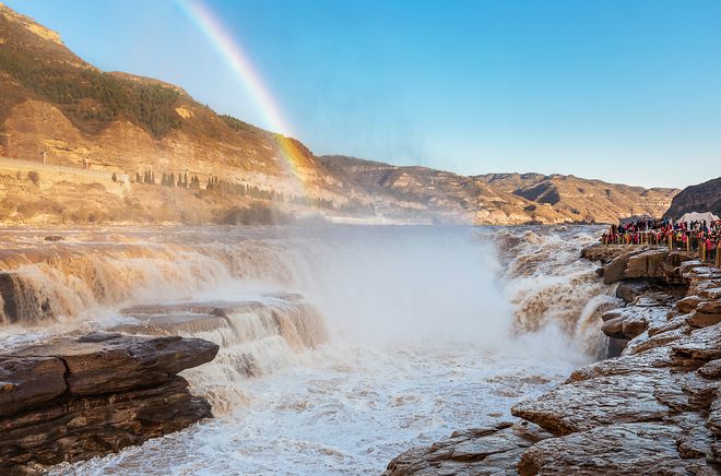 近日,受氣溫回暖影響,位于山西省吉縣和陜西省宜川縣交界處的黃河壺口瀑布冰消河開,再現(xiàn)奔騰咆哮的壯美景觀。受前一段時(shí)間凌汛影響,關(guān)閉了半個(gè)月的壺口瀑布景區(qū)于2月12日恢復(fù)對(duì)外開放。圖為2月12日,游客在山西吉縣黃河壺口瀑布游覽觀瀑(無人機(jī)照片)。