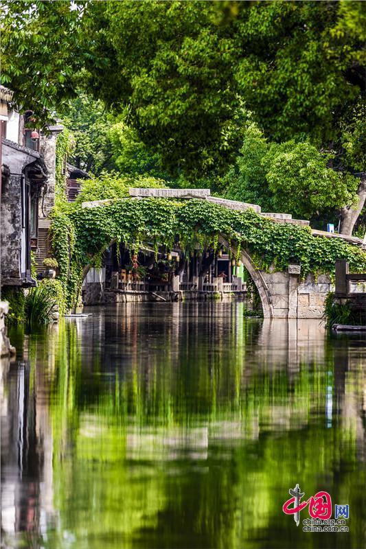 微風(fēng)里,葉子發(fā)出慵懶的聲音,泛起水巷陣陣漣漪。靜泊的小船、倒映的黛瓦古橋、長長的穿竹石欄,相映成趣。