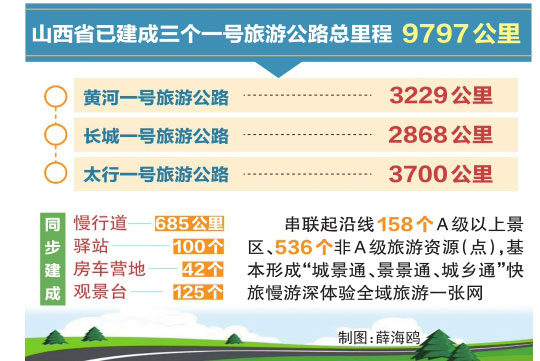 截至今年10月10日,山西省已建成三個一號旅游公路總里程9797公里。其中,黃河一號旅游公路3229公里、長城一號旅游公路2868公里、太行一號旅游公路3700公里,同步建成慢行道685公里、驛站100個、房車營地42個、觀景臺125個,串聯(lián)起沿線158個A級以上景區(qū)、536個非A級旅游資源(點(diǎn)),基本形成“城景通、景景通、城鄉(xiāng)通”快旅慢游深體驗全域旅游一張網(wǎng)。