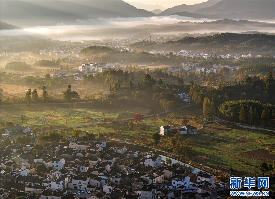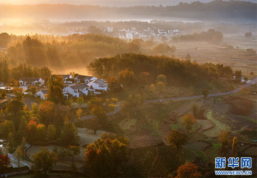 當(dāng)日,安徽省黃山市黟縣宏村、盧村等地晨霧縹緲,秋色斑斕,粉墻黛瓦掩映其中,宛如一幅幅繽紛多彩的油畫。 新華網(wǎng)發(fā)(施亞磊 攝)