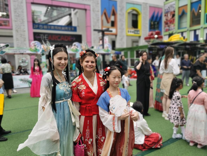 6月9日,身著中國(guó)古代服飾的外國(guó)人與中國(guó)兒童合影,參加非遺市集。新華社記者 陳愛(ài)平 攝