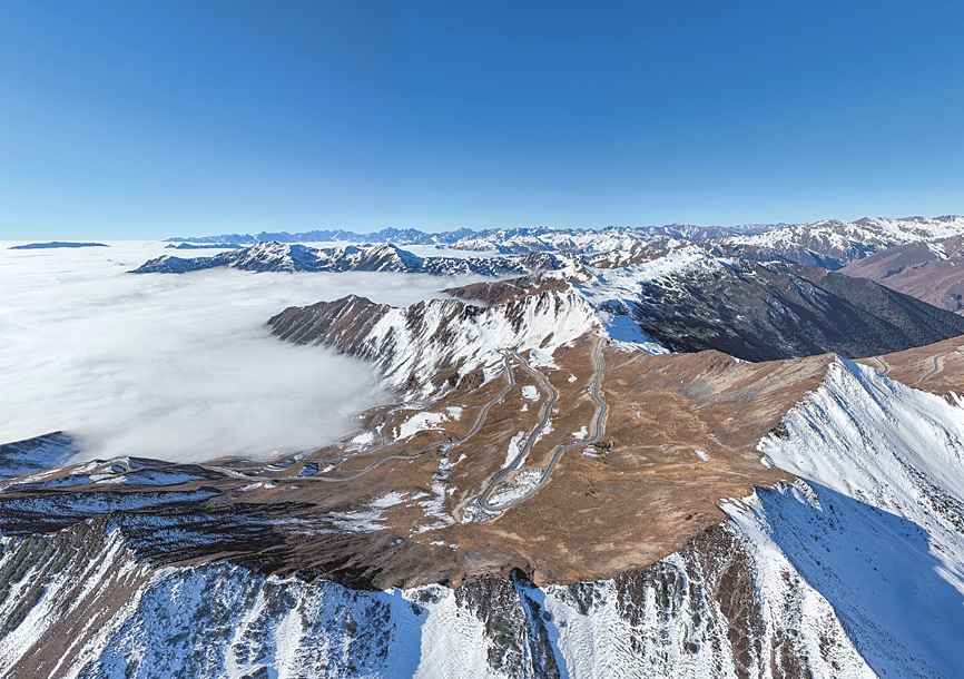圖為12月25日拍攝的四川夾金山云海(無人機(jī)照片)。冬日的四川夾金山,云海翻騰。從高空俯瞰,連綿起伏的群山被云?;\罩,呈現(xiàn)出壯美的自然風(fēng)光。