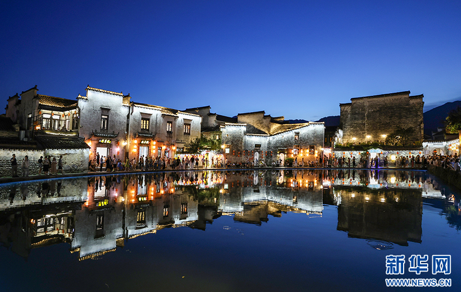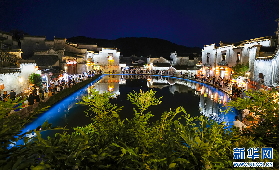 8月13日晚,安徽省黃山市黟縣宏村流光溢彩,花燈夜游表演吸引眾多游客前來參觀、游玩。