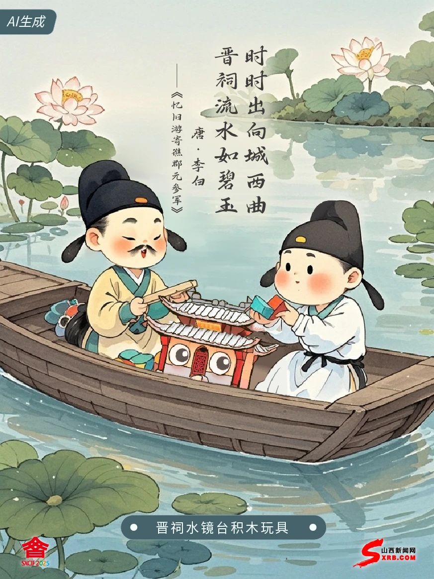 我是李白 我第一次到山西 是和我的朋友元演一起 我們?cè)跁x祠浮舟弄水恣意笙歌 直到日斜月升才歸 如今文博會(huì)以“水鏡臺(tái)”為原型 用彩色積木拼出重檐歇山頂 一榫一卯藏納乾坤 方寸之間我再次領(lǐng)略到晉祠之美
