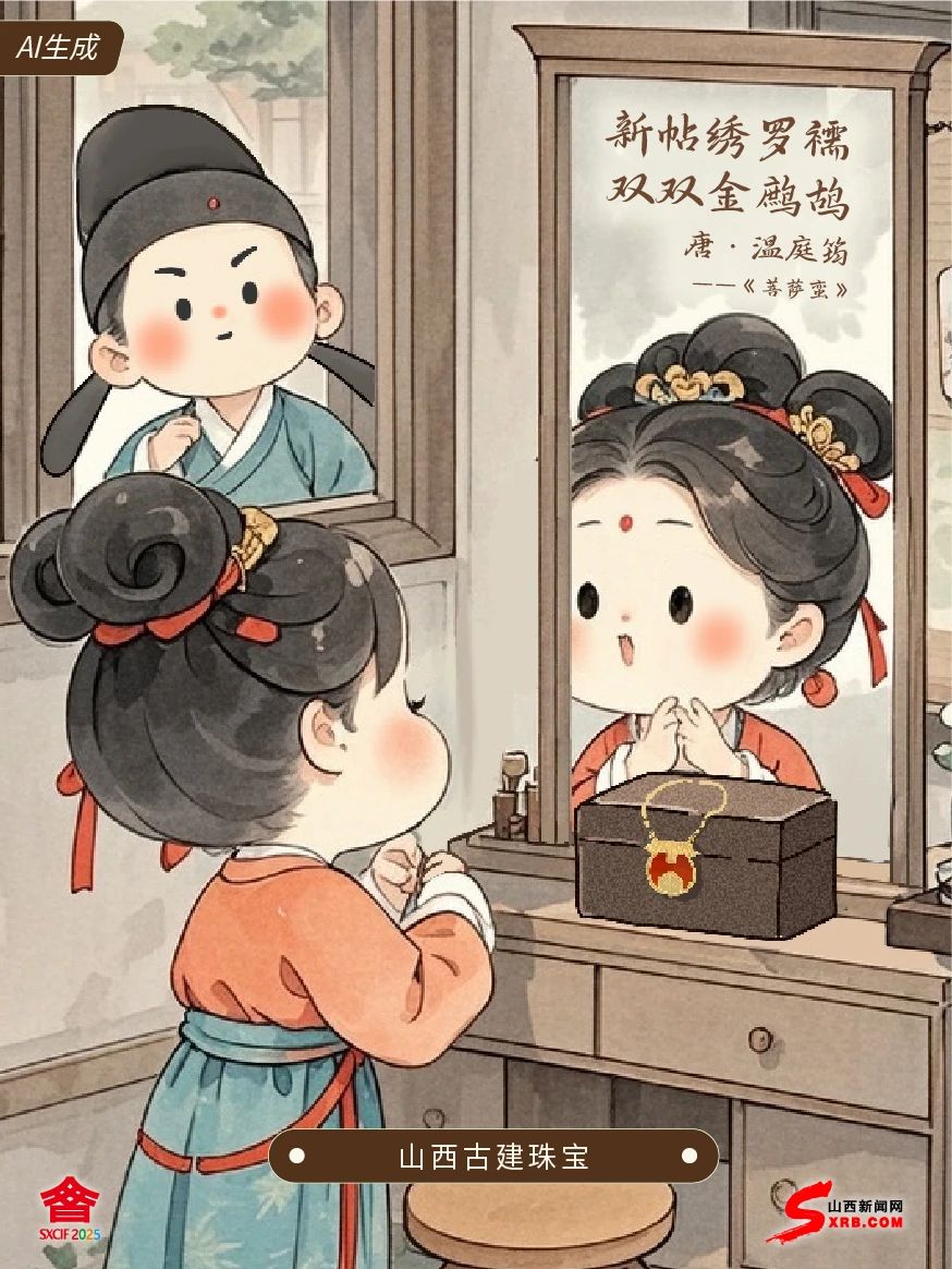 眉毛彎彎如小山 鬢發(fā)蓬松似云朵 姑娘啊,我是溫庭筠 想問(wèn)你為何對(duì)鏡傷懷 送你這條文博會(huì)上 淘來(lái)的小驚喜 珠寶項(xiàng)鏈融合建筑斗拱 正好襯你襦裙上的金鷓鴣 愿你如鳥(niǎo)斯革,熱烈飛揚(yáng)