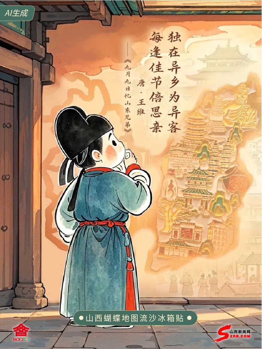 老鄉(xiāng)們 我是王維 闊別多年 終于回到家鄉(xiāng)山西 文博會(huì)上 我一眼就看見(jiàn)山西地圖做成的 蝴蝶流沙冰箱貼 蝴蝶破繭正如山西文化在當(dāng)代煥發(fā)新生 當(dāng)年我十七歲漂泊在外 重陽(yáng)登高之時(shí)分外思念家鄉(xiāng) 如今家鄉(xiāng)發(fā)展得越來(lái)越好 縱使四海為家 也始終心有歸途