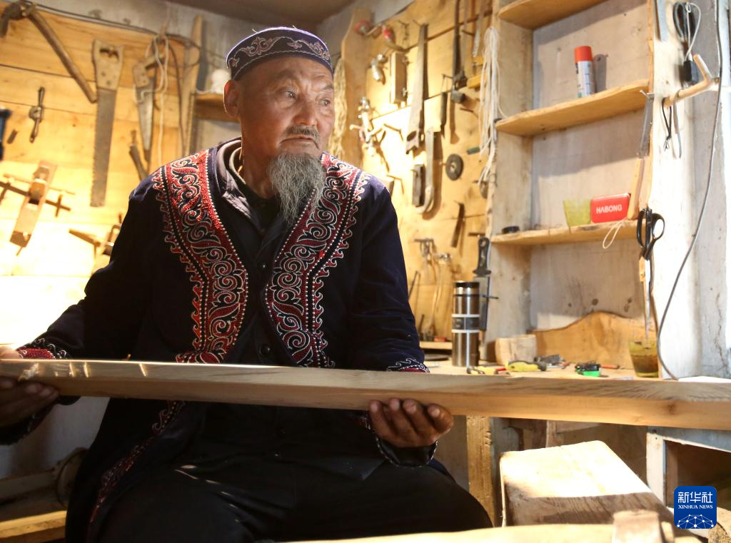 9月9日,在新疆阿勒泰“古老毛皮滑雪板制作技藝”傳習(xí)基地,斯蘭別克·沙和什制作毛皮滑雪板。