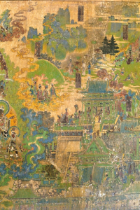 但巖山寺金代壁畫有確切年代,是御前承應畫匠王逵用10年時間才完成這一煌煌巨制。800多年前,王逵面對四壁,決然舍棄慣常的連環(huán)畫形式,大膽獨創(chuàng),采用滿幅構圖形式,以一組繁雜的宮廷建筑為中心,配以各種故事情節(jié)畫面,然后用山水、樹石、云嵐連結,細部真實,透視準確,遠看儼然一幅氣勢磅礴的大型山水畫,近瞧卻又章回分明。壁畫上就有多處使用瀝粉堆金裝飾,顯現金碧輝煌、富麗非凡的效果。這樣大面積的工筆重彩畫,一絲不茍,找不到起稿與粉本痕跡,而且線條變化多樣,無一廢筆,令人驚嘆。