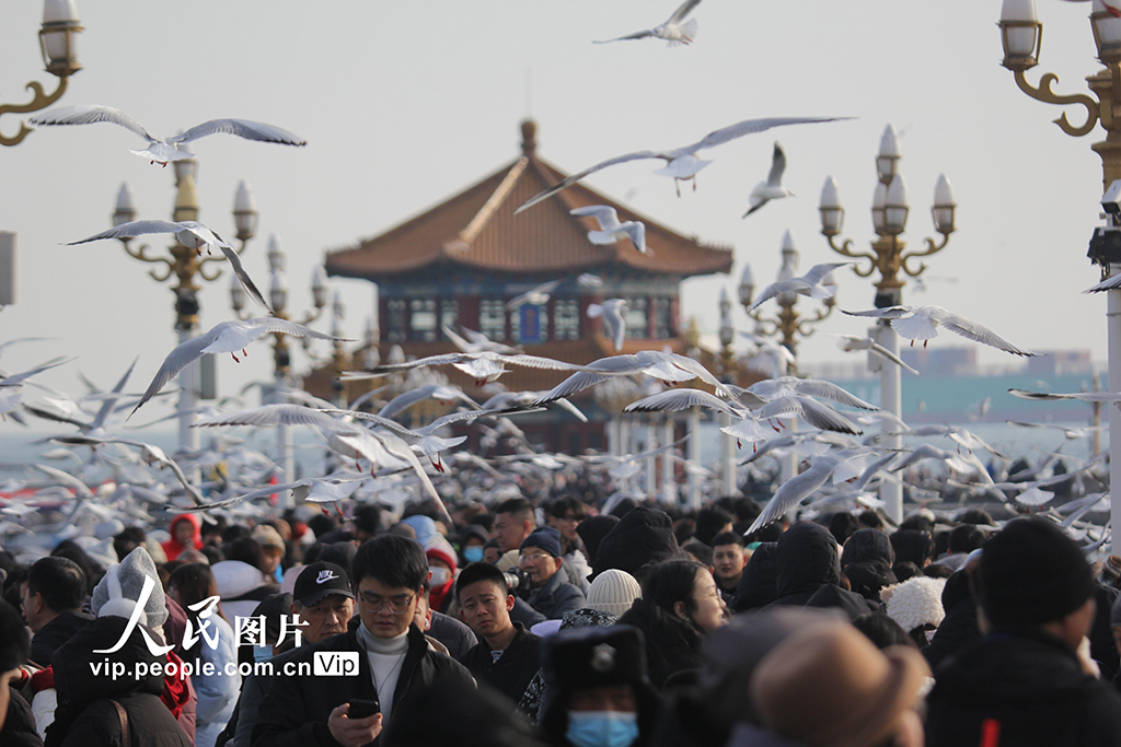 2026年1月30日,山東青島棧橋景區(qū),成群的海鷗在空中飛翔盤旋,吸引眾多游客前來觀賞互動,拍照留影。黃杰顯攝(人民圖片網(wǎng))
