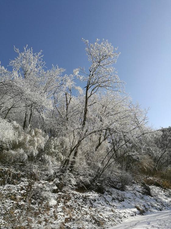 受較強(qiáng)冷空氣影響,秦嶺腹地涼風(fēng)埡山頂,出現(xiàn)大面積霧凇景觀。玉樹(shù)瓊枝,晶瑩剔透,讓涼風(fēng)埡山頂變得像童話世界一般,美不勝收。 央視記者王志杰 圖片來(lái)源:央視新聞微博