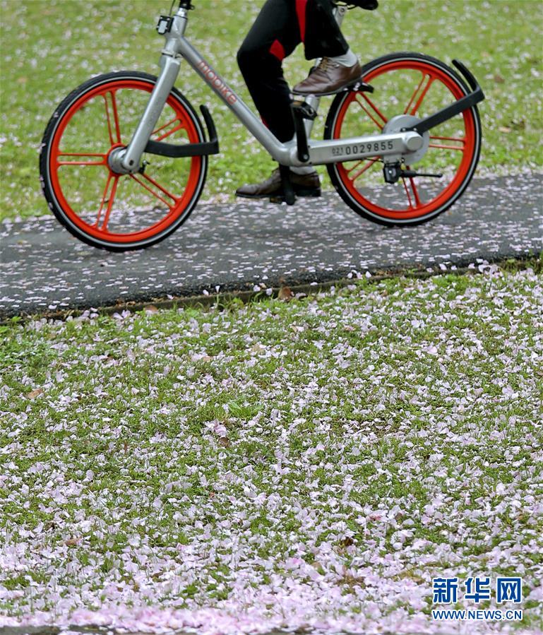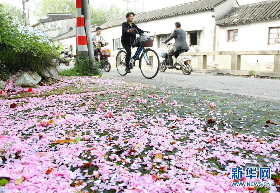 4月17日,一場(chǎng)春雨過后,蘇州市民騎車經(jīng)過落滿櫻花的盛家?guī)?。新華社發(fā)(王建中 攝)