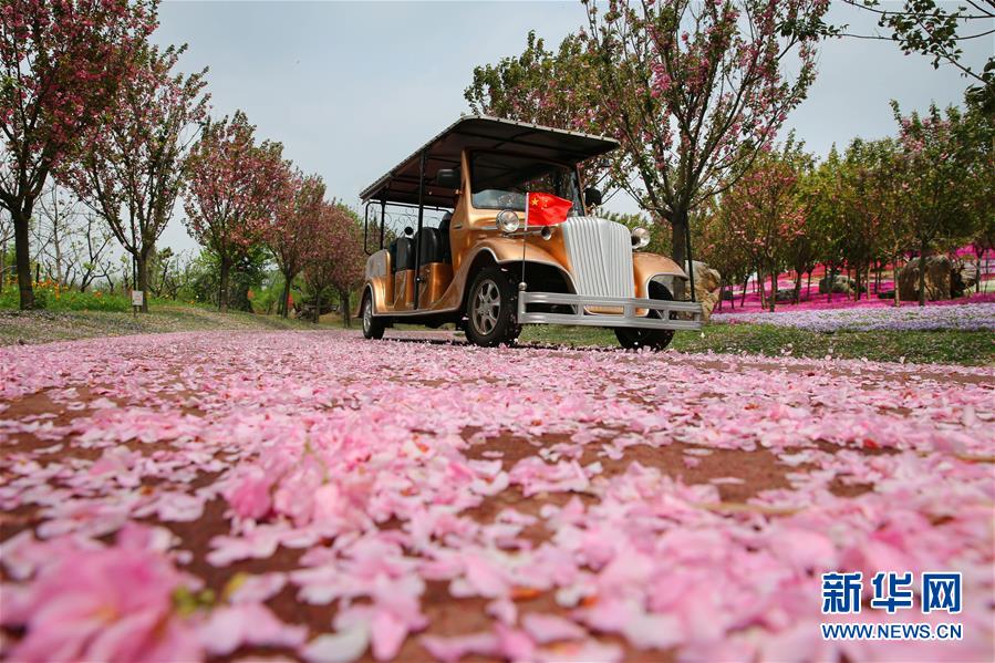 4月17日,一夜風(fēng)雨過后,江蘇南通洲際綠博園櫻花大道上櫻花花瓣飄落一地。 新華社發(fā)(許叢軍 攝)
