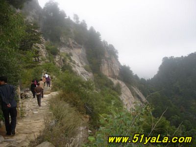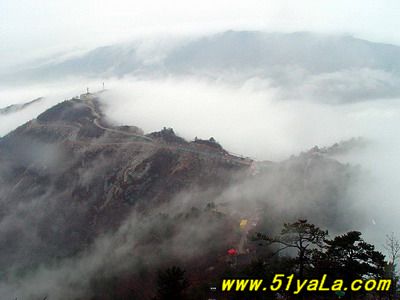 北武當(dāng)山主峰四周幾乎都是陡壁懸崖,只有一條人造“天梯”可攀。來到山腳下,過五里黃土、五里沙路,便是1400余級(jí)就山鑿筑的石階,凡險(xiǎn)峻之處,設(shè)有鐵索扶手。石階一線疊置,從下仰視,宛如“天梯”。游人攀登,每一步都可聽到悠揚(yáng)頓挫的“石音”,形成獨(dú)特的“石樂”絕景。沿著石階,奇松異石、廟宇石刻,掩沒在蔥郁的山林植被之中,相間點(diǎn)綴,相映成趣。主要的山石景觀有:古猿望日、石豬受難、九龍出洞、石象守山、天壺傾露、石羊朝圣、石龜下蛋、石虎、石蛤蟆、龜蛇斗智等。最令人稱奇的是“龜蛇斗智”奇觀,相傳神龜和青蛇不安心修道,互相格斗,經(jīng)過七七四十九天的麈戰(zhàn),神龜節(jié)節(jié)敗退,青蛇步步緊逼。其時(shí),恰逢真武大帝返宮,見狀,輕輕用手指一點(diǎn),龜蛇便動(dòng)彈不得,從此永久停留在這里,成千古一絕——“蛇石”虎視眈眈,“龜石”尾臨懸崖,萬斤重石,峭立崖畔,用力一推或經(jīng)風(fēng)一吹,便搖搖欲墜,令人心懸,所以又稱風(fēng)動(dòng)石,為我國罕見的景觀之一。主要的奇松景觀有:鴛鴦松、迎客松、托天松、母子松等。最使人嘆為觀止的是“擎天探海松”,其松立于石階半道,樹身技分兩杈,一直刺青天,一枝瞰群峰。近金頂?shù)悄咸扉T石階,旁邊陡崖上刻有“喬松”二字,據(jù)載為清代道光年間永寧州牧王繼賢手跡?,F(xiàn)存喬松樹樁直徑近1米,可以想見其昔日雄姿。主要的懸崖峭壁有:千仞壁、舍身崖、鷹嘴崖等。還有呈垂直分布的植被,其色彩和花期隨季節(jié)變化,給北武當(dāng)山披上了“春粉、夏艷、秋紅、冬白”的盛裝。登臨武當(dāng)之巔,一覽眾山,但見遠(yuǎn)山蒼茫,近日含黛,松風(fēng)撲面,白云飄逸;只聞松濤陣陣,山泉潺潺,鳥語唧唧,似琴弦輕撥;夏秋之季,如晴空萬里,金頂之下,叢林景觀相間,似七彩織錦;白云遠(yuǎn)處,群山連綿,猶如萬龍翻騰,極為壯觀。