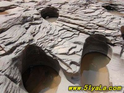 據(jù)考證,這些石窩水洼并非人工所鑿,而是經洪水激流數(shù)干年來沖擊石塊盤旋磨蝕而成,因此,每個坑從坑沿滑到壁都光滑無比,而且每個石窩里都有一個圓形石頭。明代有人作詩贊曰:“河底有天涵兔影,山間無物掩蟾光……因其孟門開寶鏡,嫣娥向晚理殘妝”。