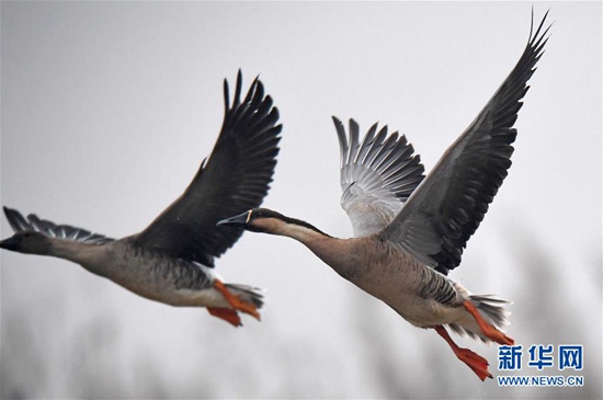 11月29日,候鳥在江西鄱陽湖南磯濕地國家級(jí)自然保護(hù)區(qū)飛翔。近日,大批南遷候鳥飛抵鄱陽湖棲息越冬。