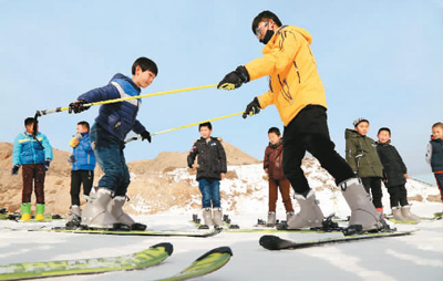 圖為在甘肅省山丹縣佛山滑雪場,近百名中小學生正在滑雪教練的指導下體驗冰雪運動樂趣。張 淵 攝(人民視覺)