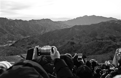 7點(diǎn)左右,天空漸亮,遠(yuǎn)山的輪廓漸漸清晰,游客們都選擇朝向東方日出的位置,舉起手機(jī)拍攝,等待迎接新年的第一縷曙光。