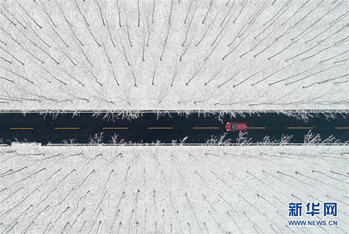12月11日,一輛汽車在山東省棗莊市臺(tái)兒莊區(qū)濤溝河濕地的道路上行進(jìn)。 當(dāng)日,受低溫天氣影響,山東省棗莊市迎來降雪。 新華社發(fā)(高啟民 攝)
