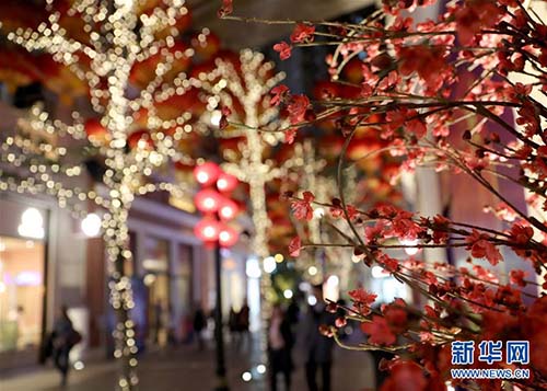 人們穿行在燈光璀璨的香港街頭(1月23日攝)。 農(nóng)歷豬年臨近,香港街頭裝扮得流光溢彩,喜氣盈盈。 新華社記者 吳曉初 攝