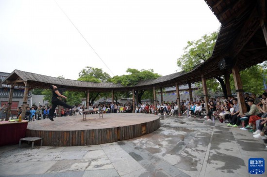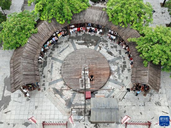 8月12日,在河北省滄州市吳橋雜技大世界景區(qū)江湖文化城,游客們觀看雜技藝人表演傳統(tǒng)雜技節(jié)目(無(wú)人機(jī)照片)。
