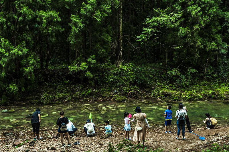 黃石寨是個(gè)“空中孤島”,所以沒有環(huán)保車,只能索道原路下山,下山不遠(yuǎn)就是金鞭溪的入口。金鞭溪全長7.5公里,是條絕佳森林伴溪水的徒步路線,只做徒步可以在兩小時(shí)完成,途中如果休息、觀景,一般三小時(shí)可以走到另一出口——水繞四門,這里就又有環(huán)保車了,下一站就是山下的另一景點(diǎn)“十里畫廊”,可以小火車可以徒步,“畫廊”并不長,想拍照還是徒步比較好。
