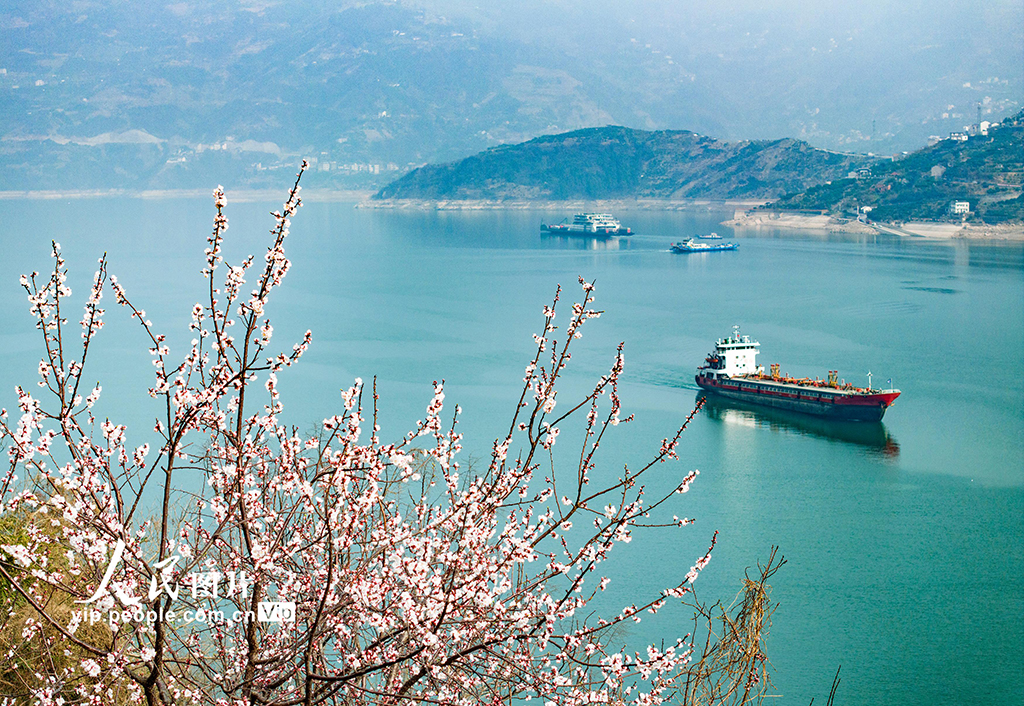 春風(fēng)送暖,大地回春,位于湖北省宜昌市的長(zhǎng)江三峽西陵峽兩岸櫻桃花、杏花相繼開(kāi)放,生機(jī)盎然,船舶航行江面,宛如畫(huà)中,美不勝收。吳承忠攝(人民圖片網(wǎng))