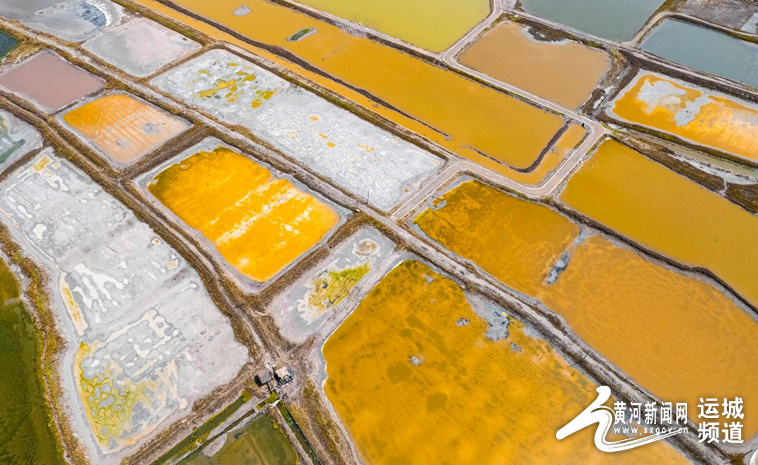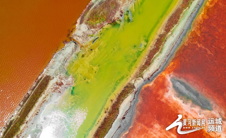 4月14日無人機(jī)拍攝的山西運(yùn)城鹽湖。近日,隨著氣溫不斷升高,山西運(yùn)城鹽湖呈現(xiàn)五彩斑斕的景象,美不勝收。