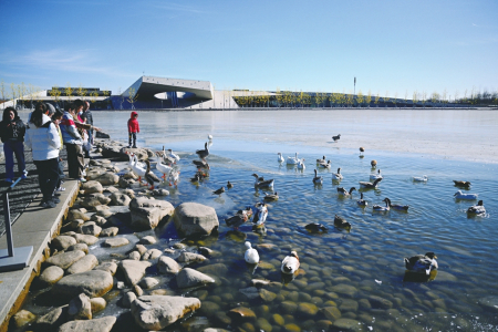 1月11日,太原植物園內(nèi),鵝、野鴨等禽鳥與游客互動(dòng)嬉戲。近年來,該園良好的生態(tài)環(huán)境吸引了眾多鳥類前來?xiàng)ⅲ纬梢坏篮椭C美麗的風(fēng)景。