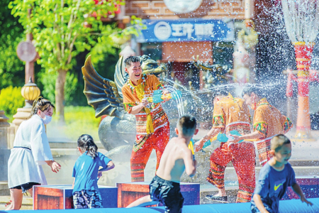 炎炎夏日,怎么能少了玩水的樂趣?活動(dòng)期間,樂園精心打造充滿濃郁“傣式”風(fēng)情的潑水活動(dòng)。身著傣族特色服飾的NPC們組成巡游隊(duì)伍,手持水盆、水槍,與沿途游客熱情互動(dòng)。“傣趣造浪潑水大戰(zhàn)”更是將歡樂氛圍推向高潮,游客們手持“武器”,展開激烈的潑水對(duì)決。還有《昆侖探秘》《大禹治水》等水上游樂項(xiàng)目,讓游客盡享清涼,與夏天的快樂撞個(gè)滿懷!