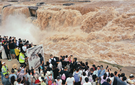 8月10日,一名畫家在吉縣黃河壺口瀑布景區(qū)現(xiàn)場(chǎng)創(chuàng)作(左圖)。連日來(lái),吉縣黃河壺口瀑布水量持續(xù)增大,形成壯美瀑布群景觀,奔騰咆哮的雄姿吸引了眾多書(shū)畫愛(ài)好者前來(lái)創(chuàng)作。