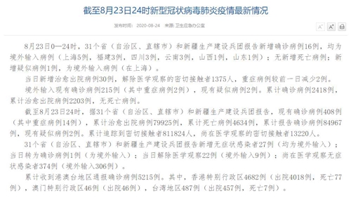 人民網(wǎng)北京8月24日電(董童)國家衛(wèi)生健康委于今日在官網(wǎng)發(fā)布的《截至8月23日24時新型冠狀病毒肺炎疫情最新情況》(以下簡稱“情況”)提出,8月23日0—24時,31個?。ㄗ灾螀^(qū)、直轄市)和新疆生產(chǎn)建設(shè)兵團報告新增確診病例16例,均為境外輸入病例(上海5例,福建3例,四川3例,云南3例,山西1例,山東1例);無新增死亡病例;新增疑似病例1例,為境外輸入病例(在上海)。當(dāng)日新增治愈出院病例30例,解除醫(yī)學(xué)觀察的密切接觸者1375人,重癥病例較前一日減少2例。