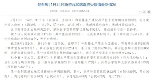 截至9月1日24時,據(jù)31個?。ㄗ灾螀^(qū)、直轄市)和新疆生產(chǎn)建設(shè)兵團(tuán)報(bào)告,現(xiàn)有確診病例198例(其中重癥病例3例),累計(jì)治愈出院病例80234例,累計(jì)死亡病例4634例,累計(jì)報(bào)告確診病例85066例,無現(xiàn)有疑似病例。累計(jì)追蹤到密切接觸者816307人,尚在醫(yī)學(xué)觀察的密切接觸者7587人。